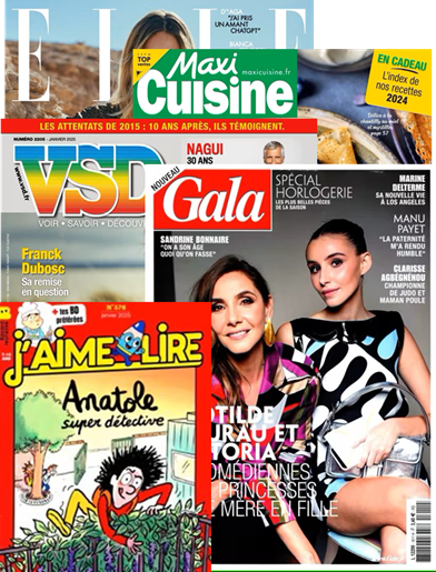 Un pack presse familial qui combine mode et inspiration (Elle), actualité et société (VSD), glamour et célébrités (Gala), recettes savoureuses (Maxi Cuisines)… et une touche ludique avec J’aime Lire, le magazine préféré des enfants